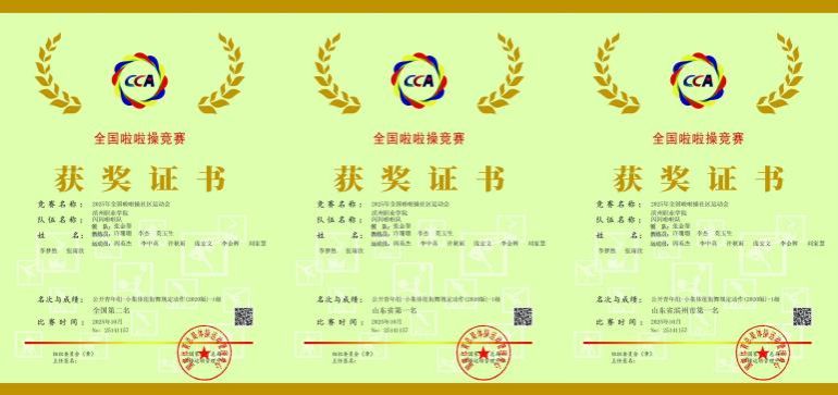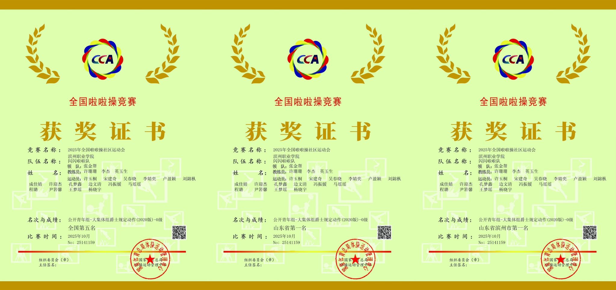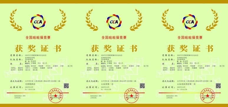 我校啦啦操3支参赛队伍分别荣获公开青年组规定动作全国第二名、全国第四名、全国第五名的优异成绩,同时均获山东省第一名、滨州市第一名。