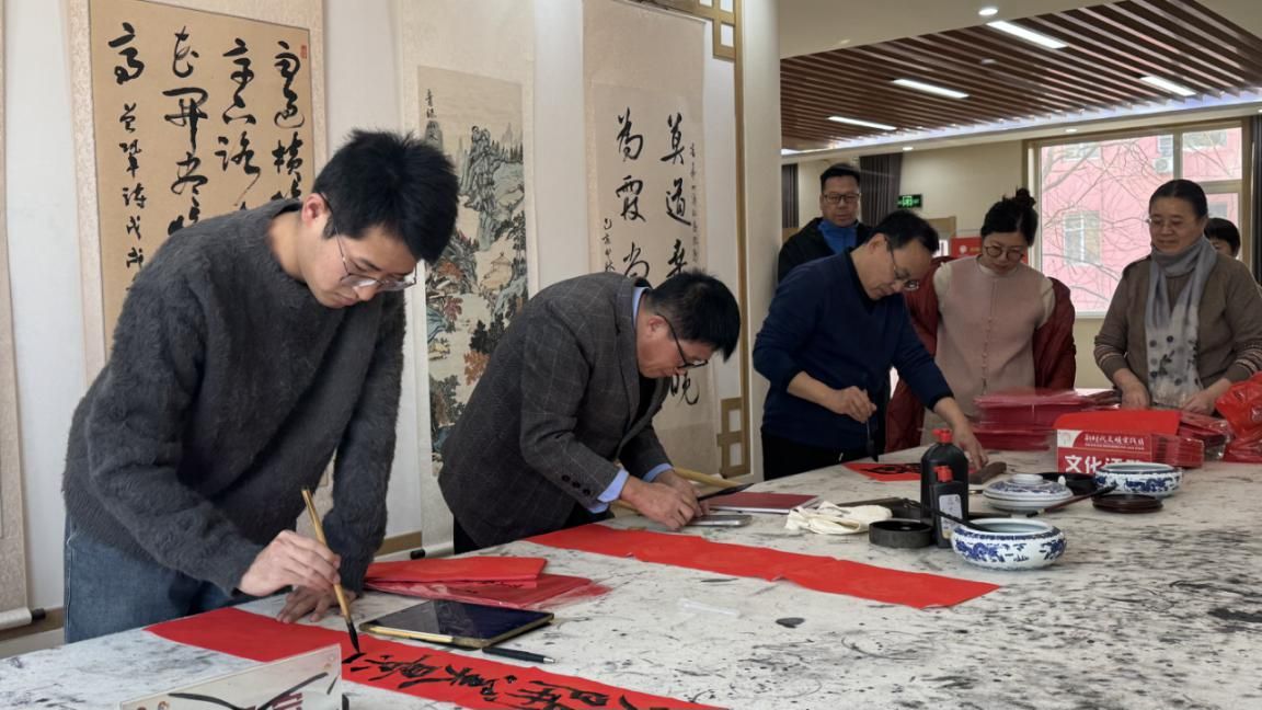 活动前期,人文学院党总支充分发挥学科优势,广泛动员学院书法专业教师、党员骨干、书法爱好者组成志愿服务队,提前筹备红纸、笔墨、砚台等物资。活动现场,翰墨飘香、暖意融融,志愿者们铺纸研墨、挥毫泼墨,笔走龙蛇间,一幅幅寓意吉祥的春联跃然纸上。最后,人文学院党总支书记将新春对联赠予北海社区,北海社区负责人对此表示衷心感谢。
